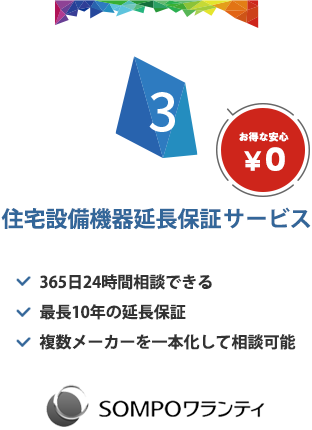 メーカー保証期間は通常1年間ですが、当社はメーカー保証期間を含む最長10年間、24時間365日体制で無料修理を可能にする「すまいの設備機器保証」に加盟しております。