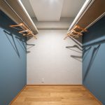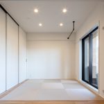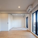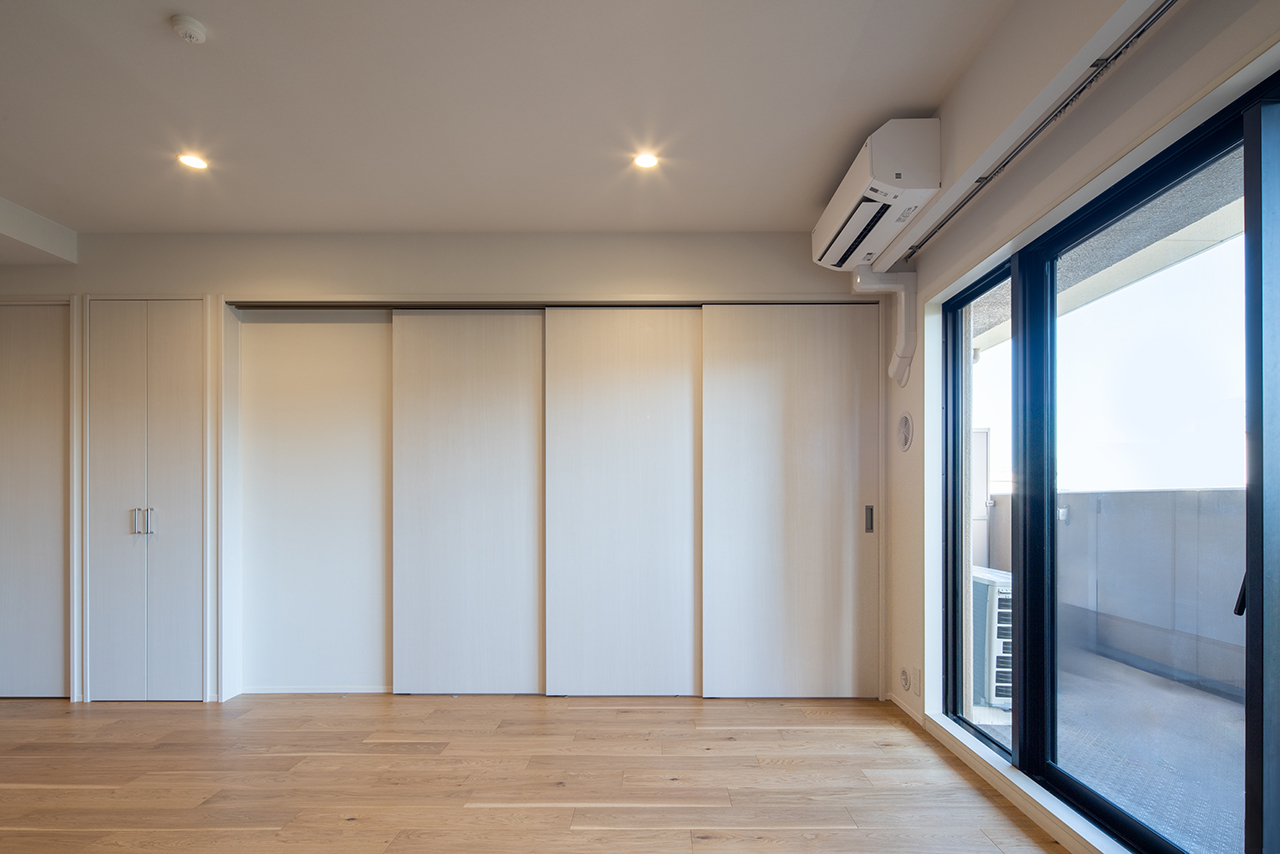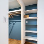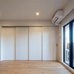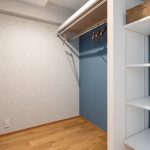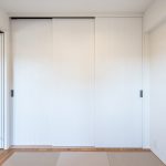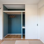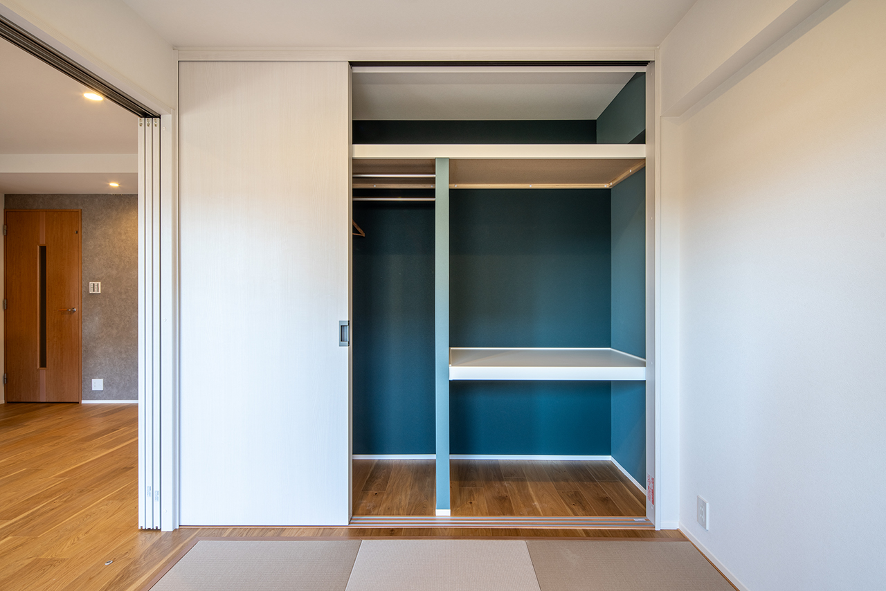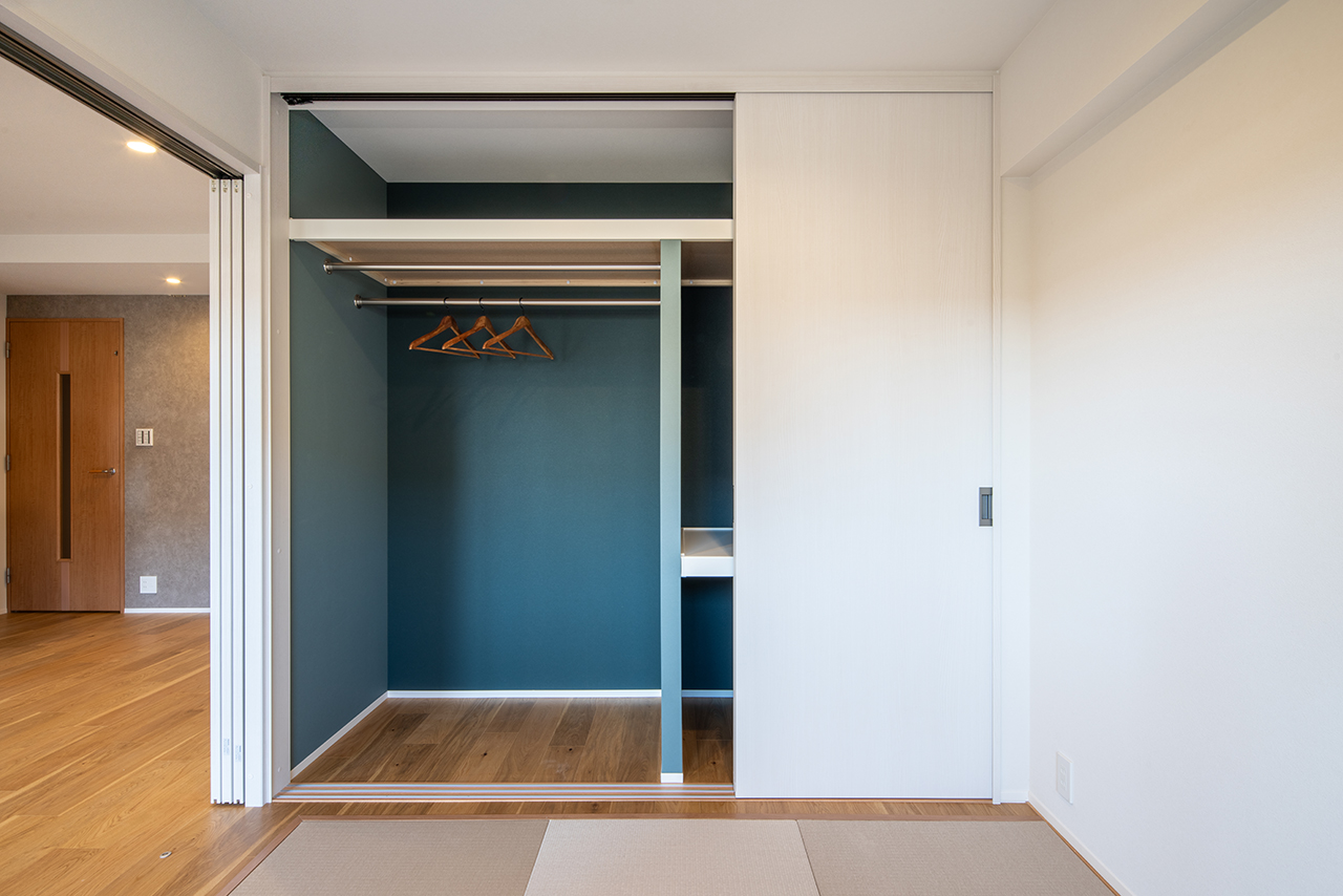 居室部分では「余計な家具は置かず、収納量を増やしてすっきり暮らす」ことをテーマに改善を図りました。6畳の和室は4.5畳に縮小し、押入れは布団収納とクローゼットを兼ねた仕様に変更。奥行きを活かした2列のハンガーパイプを設け、機能的な収納を実現しています。