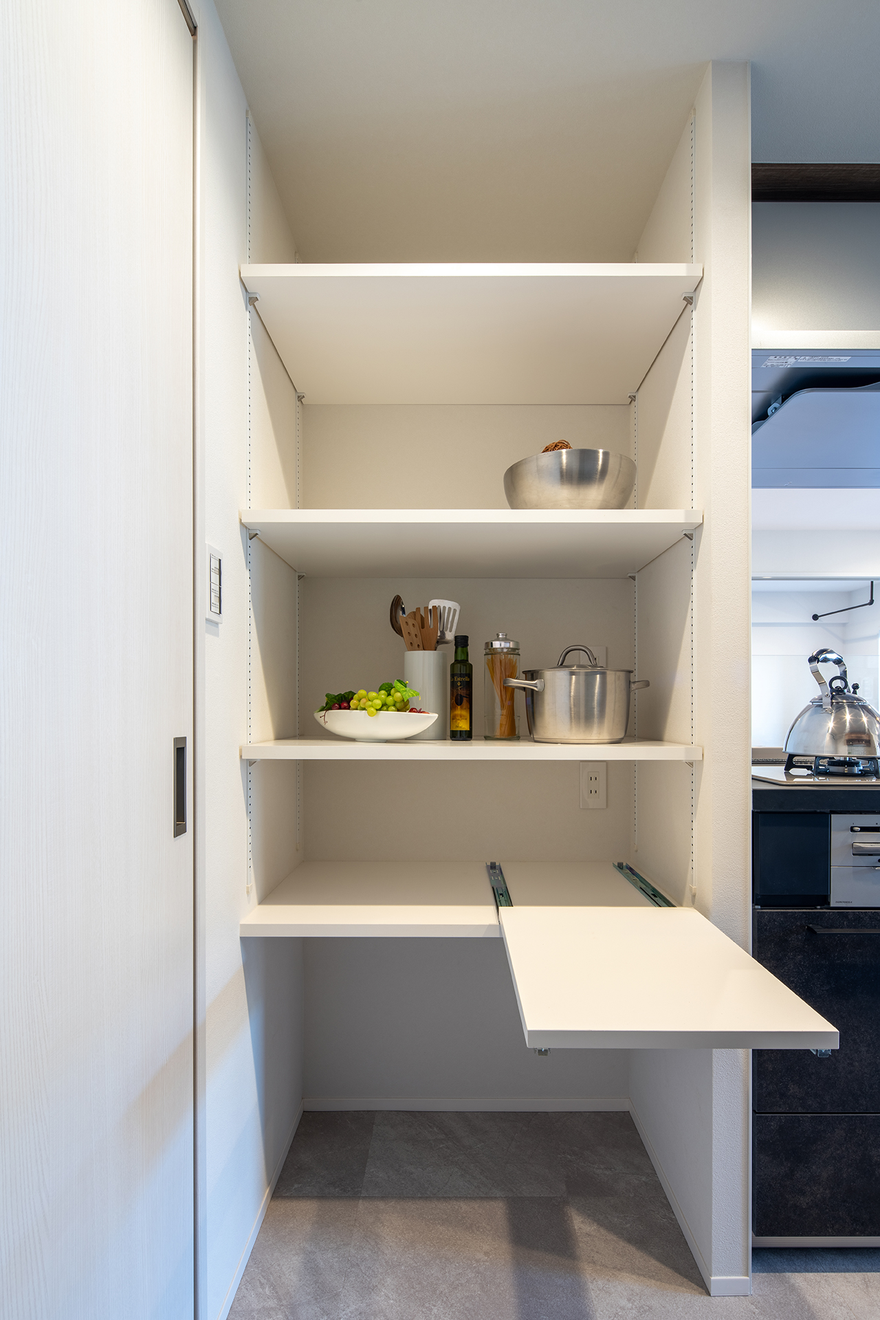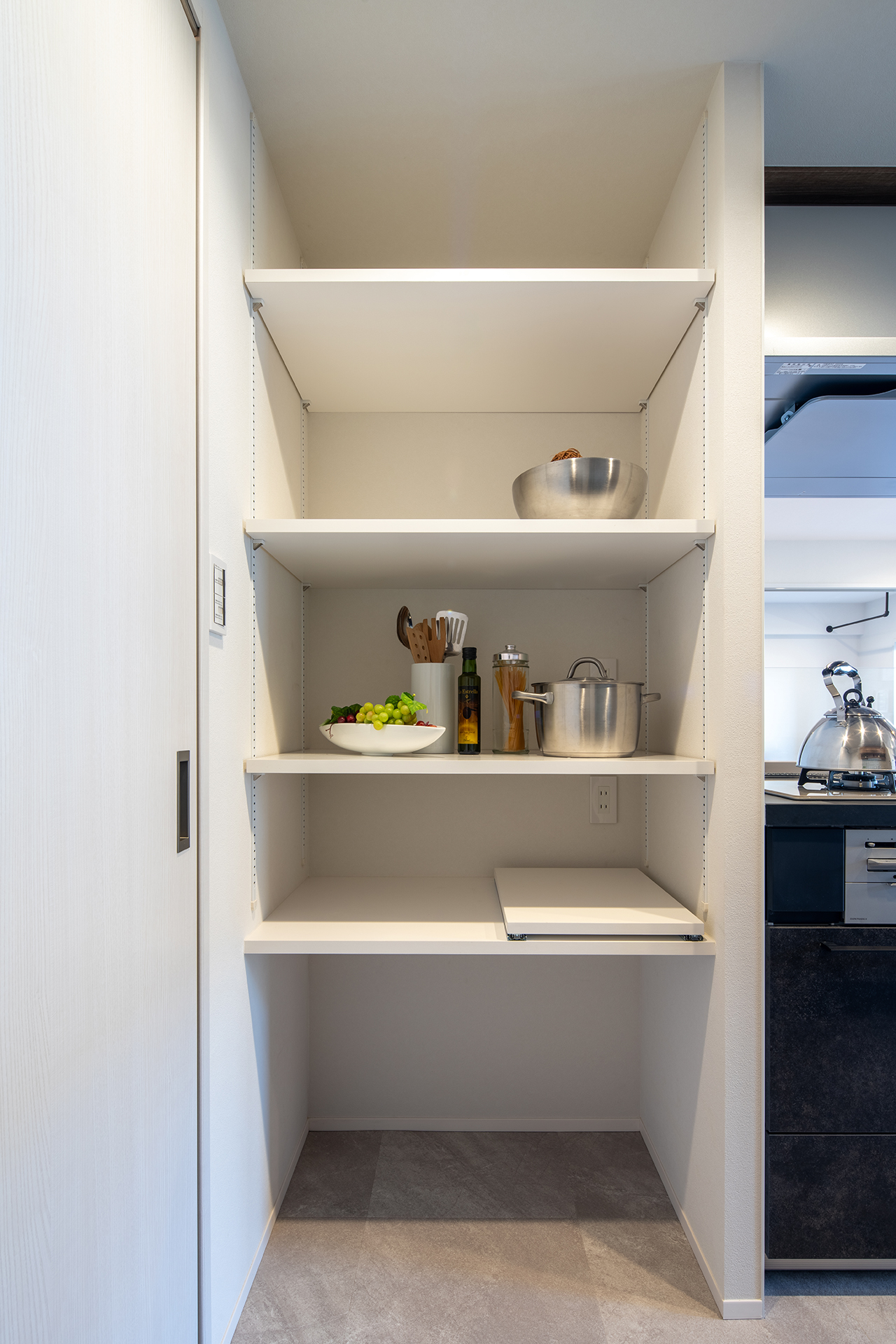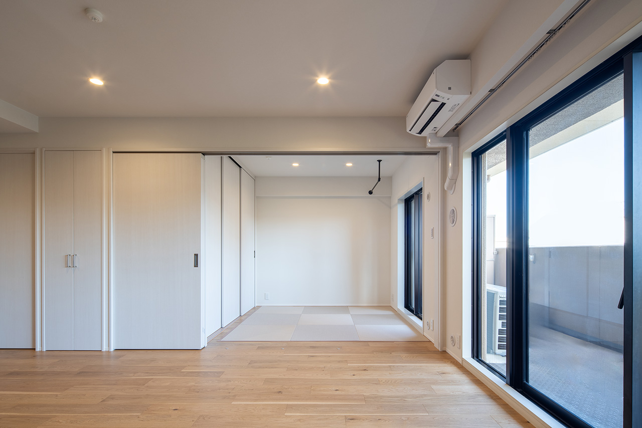 和室を縮小して生まれたスペースと洋室の一部を組み合わせ、約2畳のウォークインクローゼットを新設。洋室側の既存開口を活かしたダイレクトな動線で、収納物が取り出しやすく、気軽に使える空間となりました。リビングからもアクセスでき、普段の片付けもスムーズです。