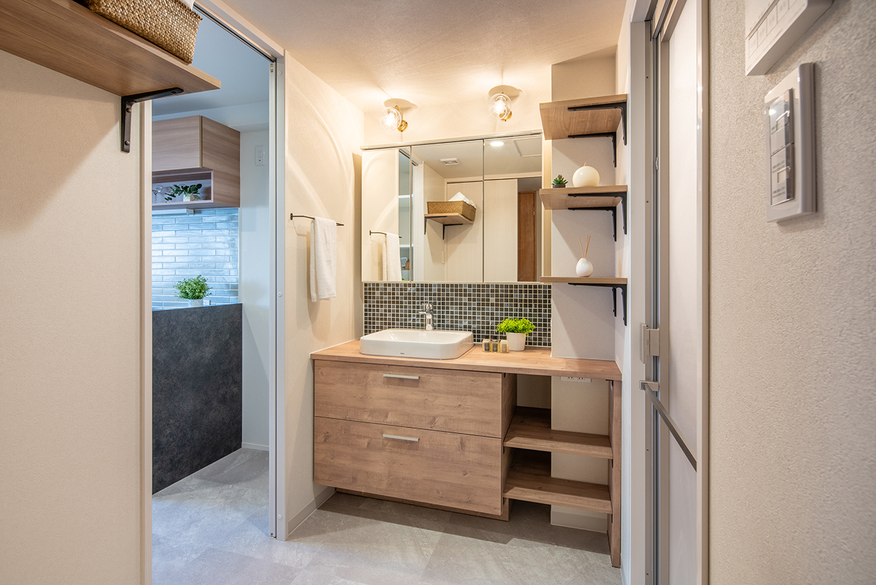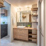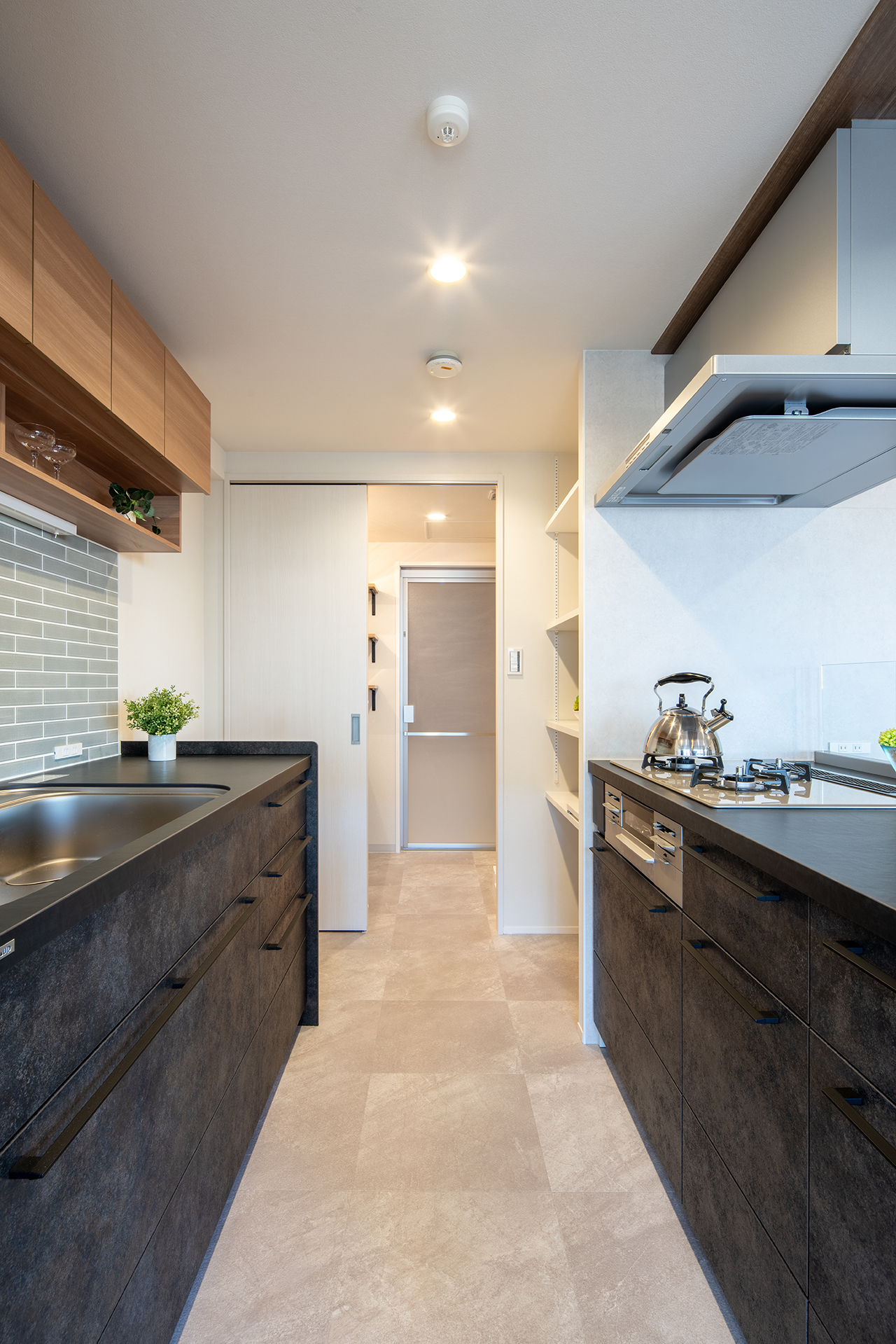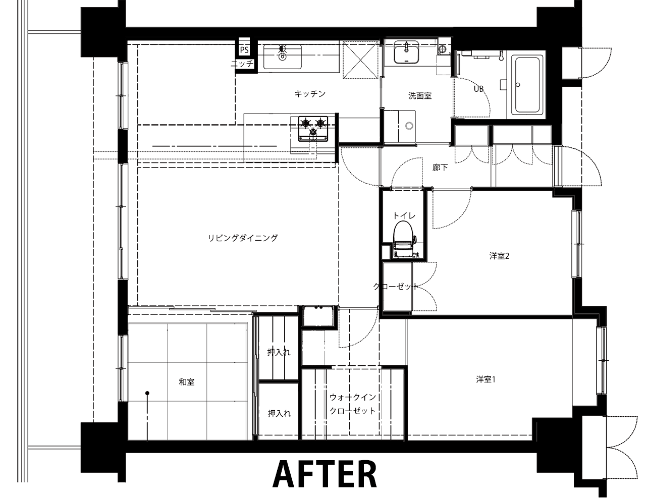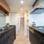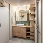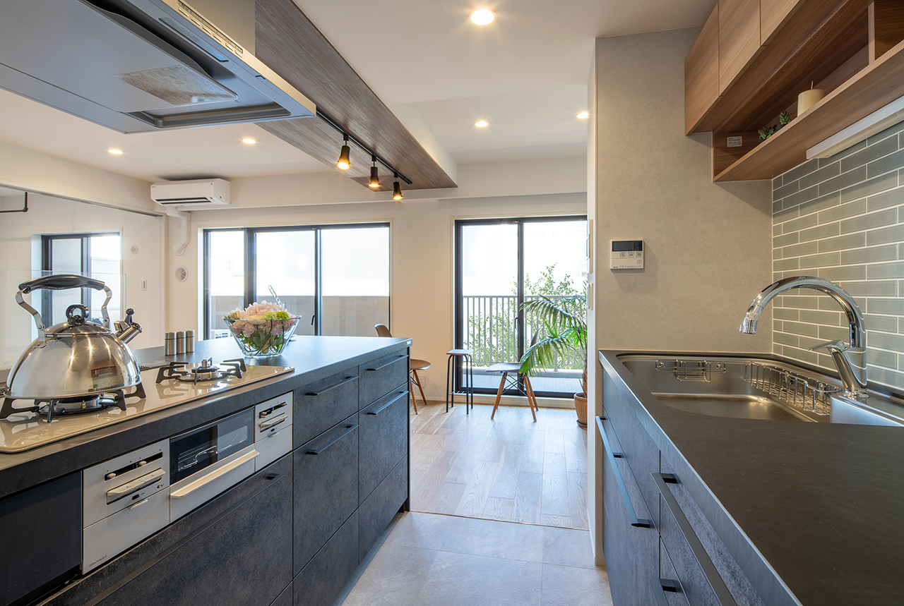 玄関から洗面・浴室を経てキッチンからリビングまでが回遊できる間取りは便利でしたが、L型キッチンによりS字動線が発生し、ダイニングへのアクセスに不便さがありました。そこでキッチンをII型(2列型)に変更。ダイニングまで直線で回遊できるようになり、よりスムーズな家事動線を実現しました。