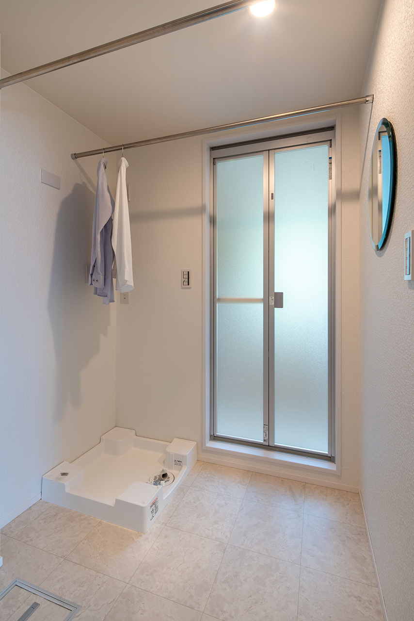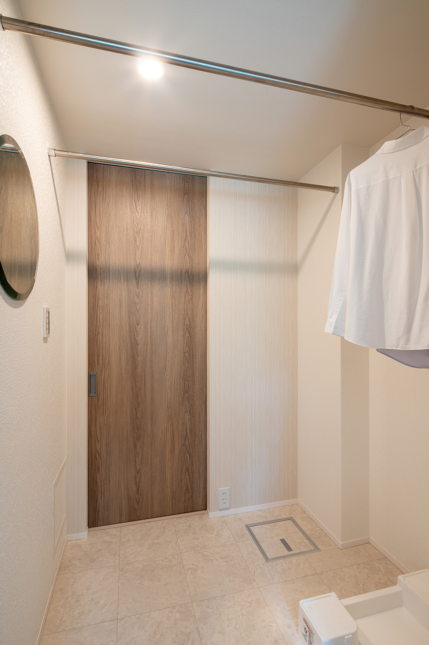 浴室横の脱衣所は、室内干しができるランドリースペースとして計画。
