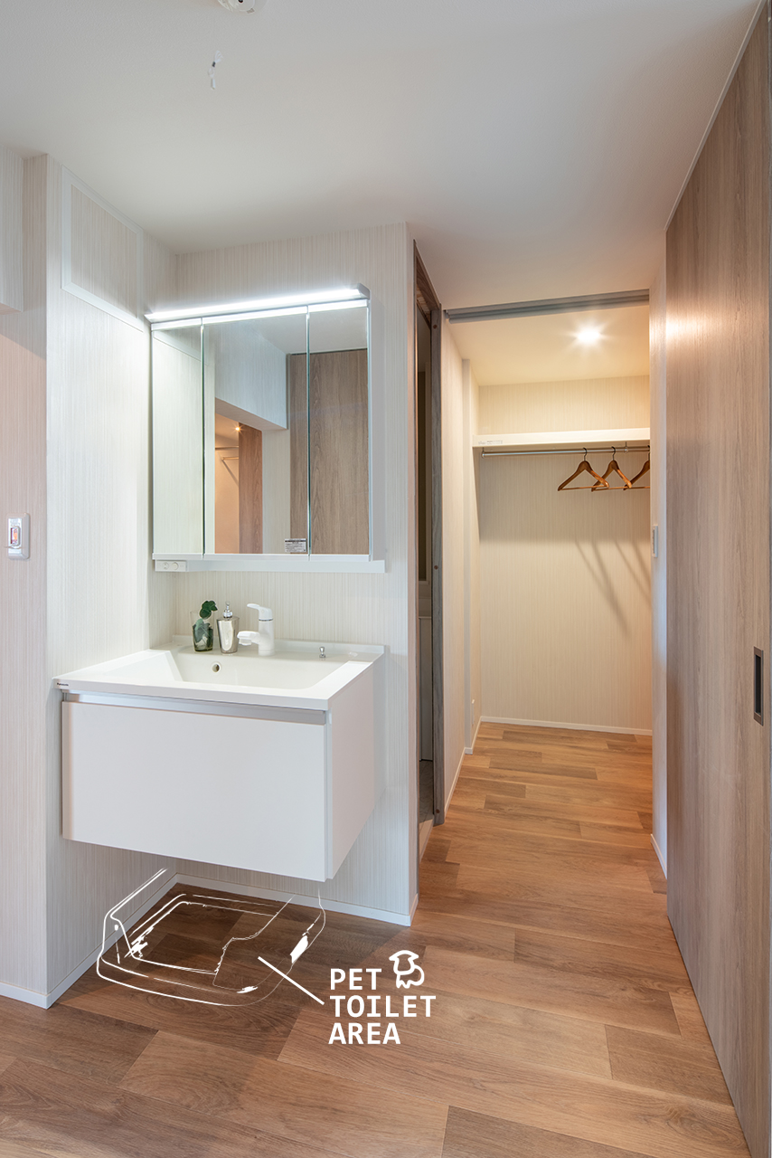 シンク下にはペット(ワンちゃん)のトイレを置くため、フロートタイプを計画。すっきりと収まる上、衛生管理もしやすくなります。