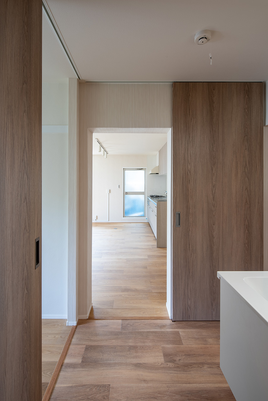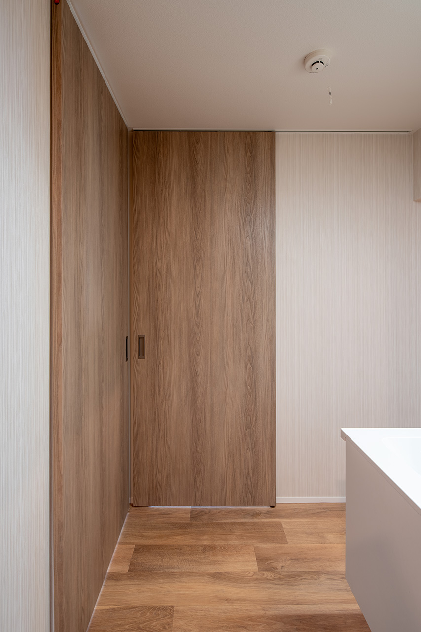 ・動線上の有効開口を確保するため扉を設けず、ロールスクリーンで仕切り開放感と使い勝手を両立しています。