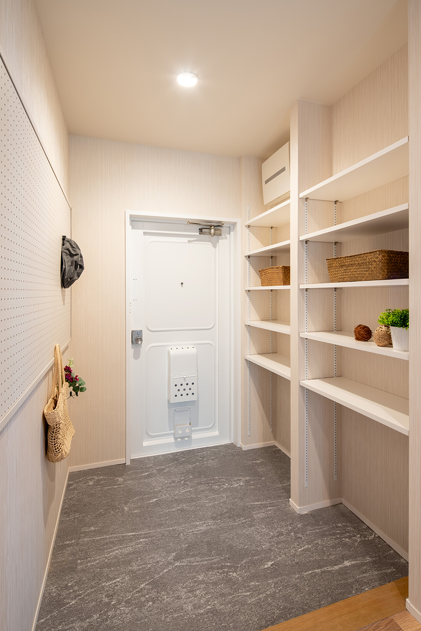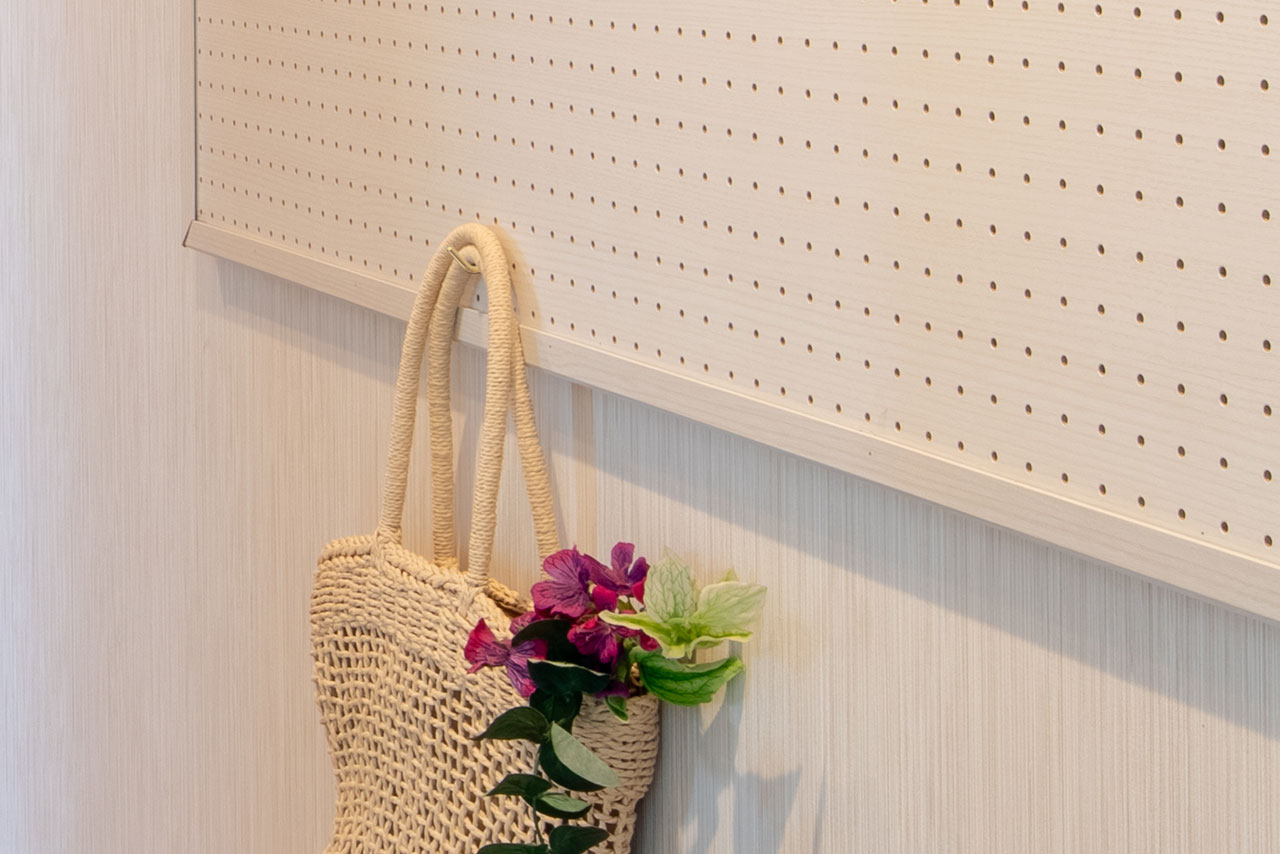 玄関には有孔ボードを設置し、バッグや帽子を壁掛けできる壁面収納に。