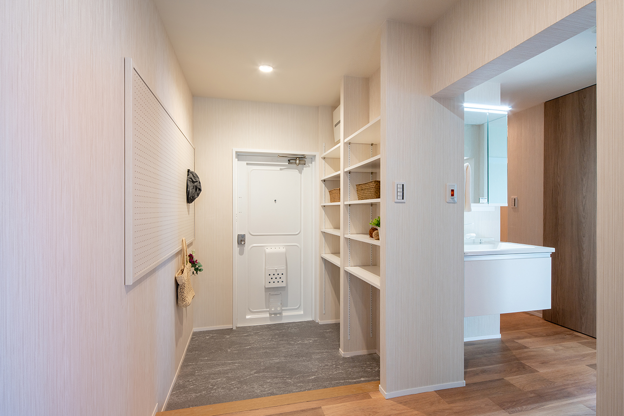 家事や身支度がしやすく、帰宅時はすぐに手洗いを行え、家族が入浴中でも使用できるよう、洗面台を脱衣所から移設。寝室(洋室)やリビングからもアクセスしやすい場所のため、起床から就寝までの動線がスムーズです。