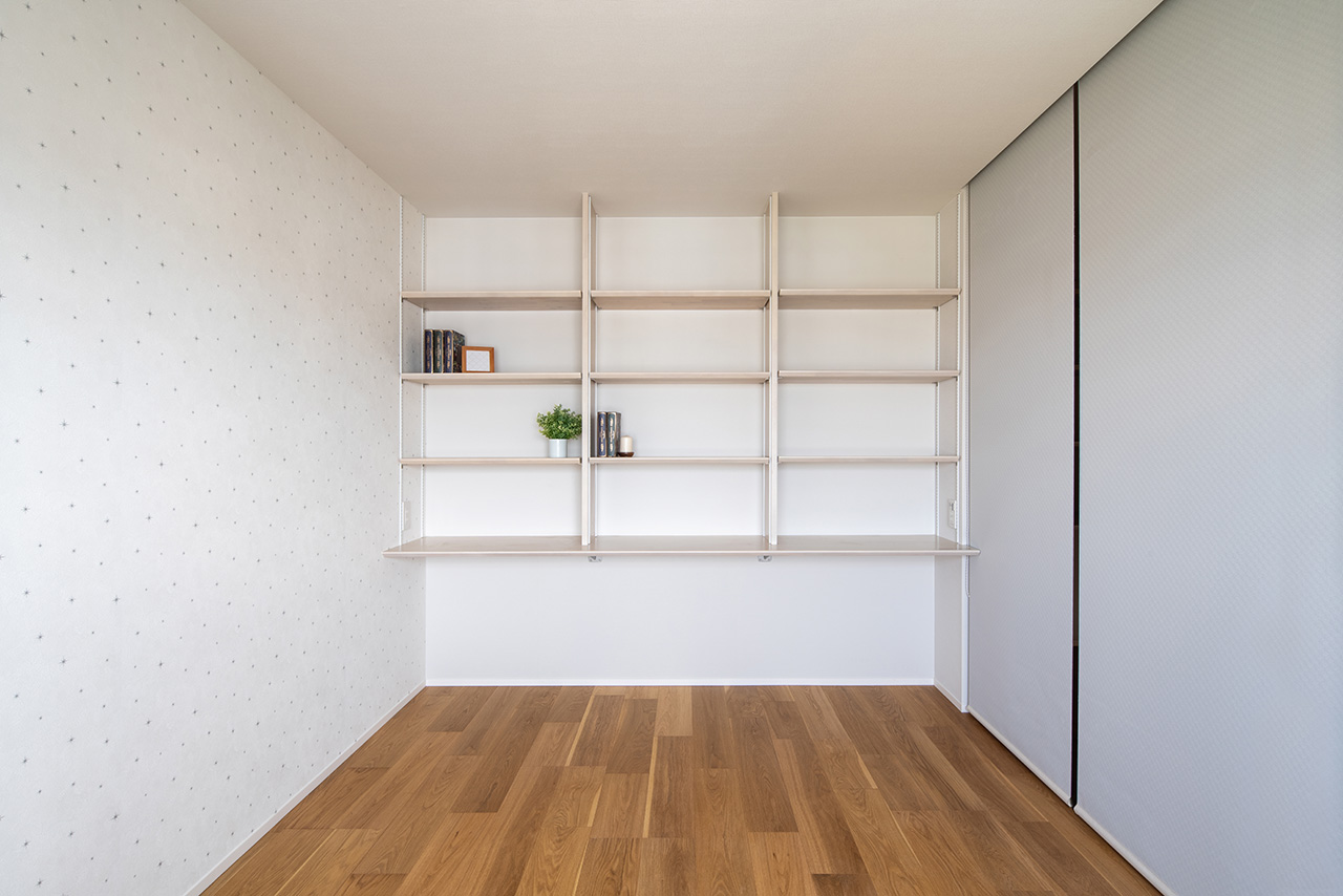 壁一面に造作した可動棚付きの収納は、デスクとしてはもちろん、多機能に活用できる可変設計です。