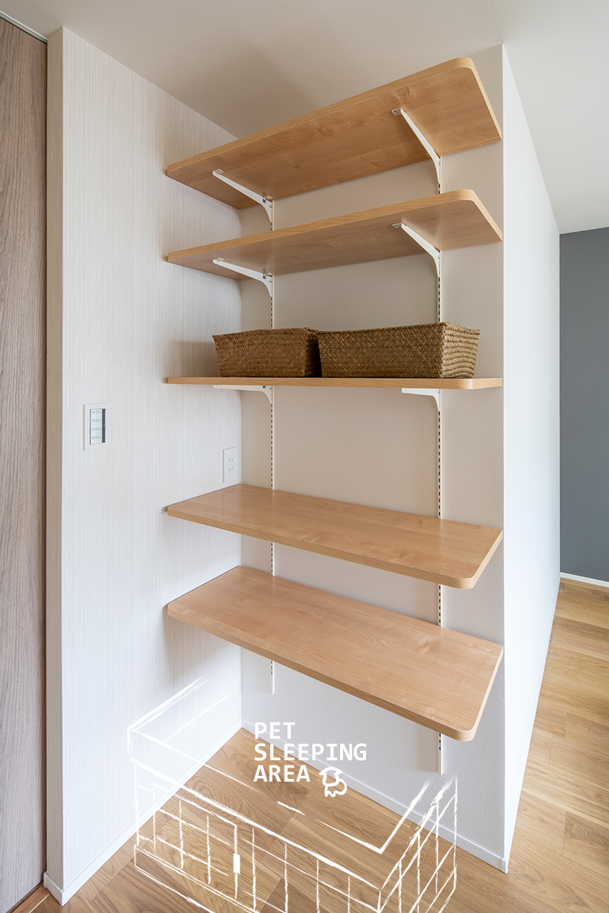 ワンちゃんのスリーピングエリア上には、可動棚を設置しており関連用品を収納できます。