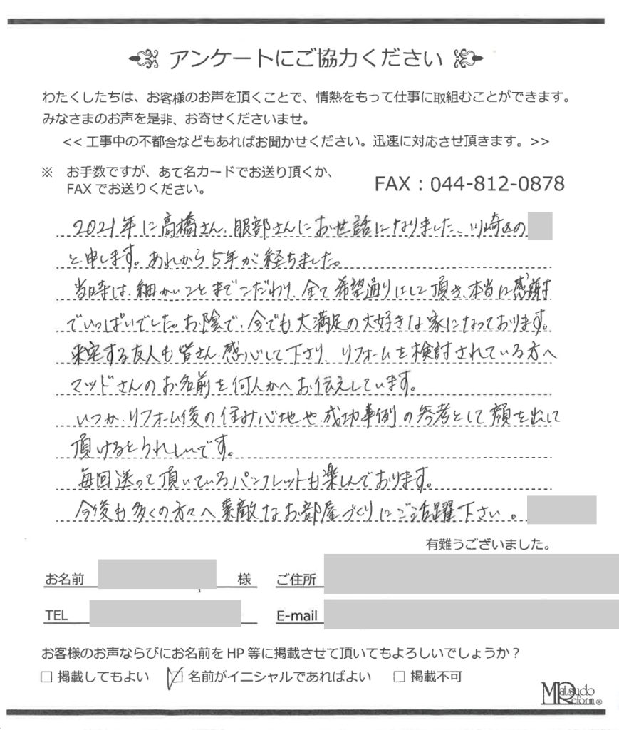 2021年に高橋さん、服部さんにお世話になりました、川崎区の**と申します。あれから5年が経ちました。当時は、細かいことまでこだわり全て希望通りにして頂き、本当に感謝でいっぱいでした。お陰で今でも大満足の大好きな家になっております。