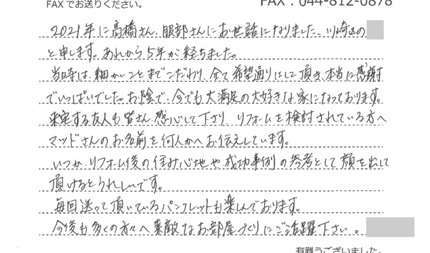 2021年に高橋さん、服部さんにお世話になりました、川崎区の**と申します。あれから5年が経ちました。当時は、細かいことまでこだわり全て希望通りにして頂き、本当に感謝でいっぱいでした。お陰で今でも大満足の大好きな家になっております。